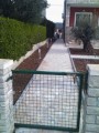 The courtyard is decorated with greenery and surrounded by a fence. Parking is arranged cubes.